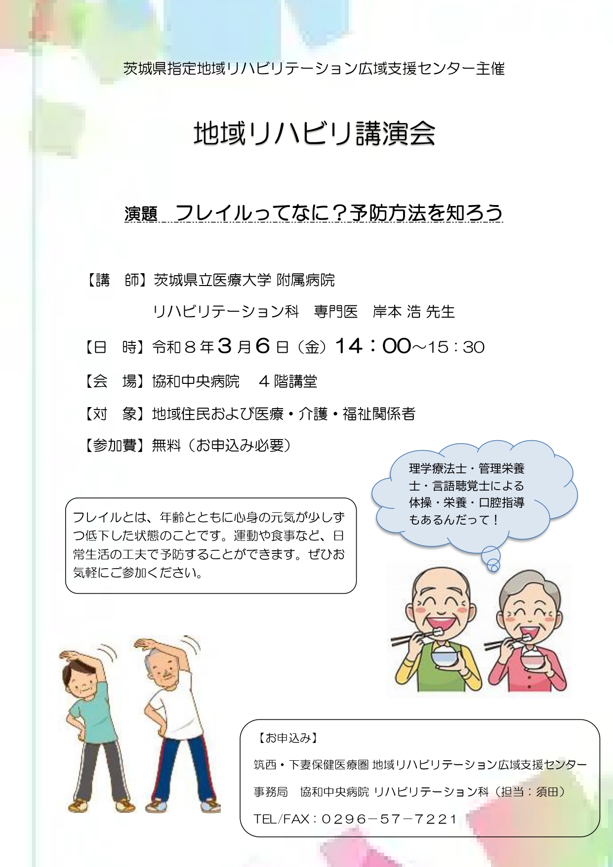 今回はフレイル予防について、茨城県立医療大学付属病院の岸本浩先生(リハ専門医)の講演および当院のPT・ST・管理栄養士の体操や食事メニュー等の指導も実施いたします。